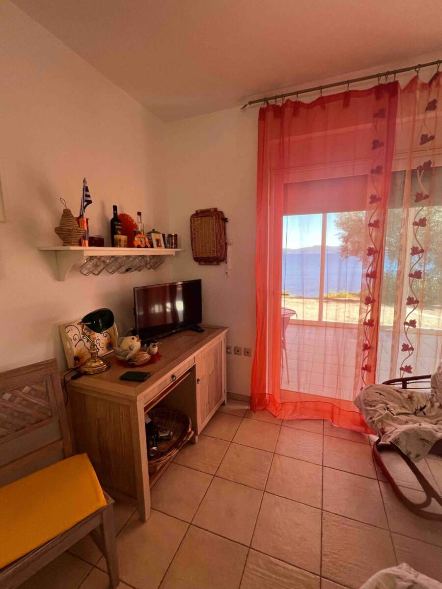 The heart of the villa is a bright and airy living room, characterized by large windows that frame stunning views of the shimmering sea and the picturesque Kastos Island. Natural light floods the space, creating an inviting atmosphere for relaxation and entertaining. The adjacent kitchen is functional and stylish, equipped with modern appliances and ample storage, making it a perfect gathering spot for culinary enthusiasts.
